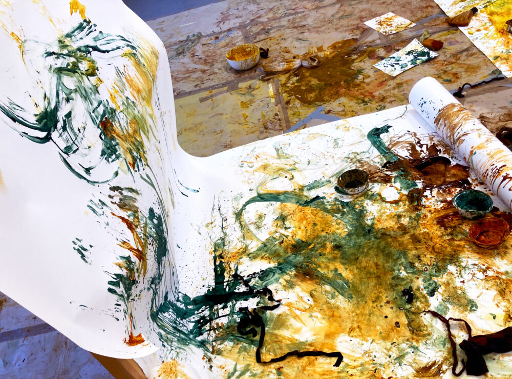 Virginie et Marie-Rose débordent d’idées et souhaitent poursuivre leur travail avec les tout-petits. Marie-Rose : « Nous aimerions réaliser une performance avec des bébés et des tout-petits, comme nous le faisons déjà, mais cette fois avec un public uniquement observateur. » Virginie : « Nous réfléchissons aussi à la manière d’agrandir et de renforcer l’aspect spatial et sensoriel du paysage pictural, par exemple en projetant simultanément une captation en direct de l’atelier sur le plafond. »