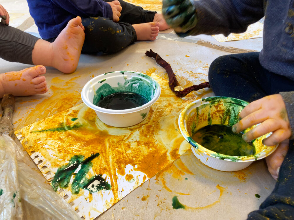 Les artistes utilisaient pour ces ateliers des peintures naturelles à base de betterave rouge, curcuma, paprika doux, coquille de noix… Virginie : « Nous préparions la peinture fraîche à la crèche, ce qui prenait un certain temps. À l’avenir, nous voudrions la réaliser en présence des enfants, car il est enrichissant de voir comment les épices deviennent des couleurs. »