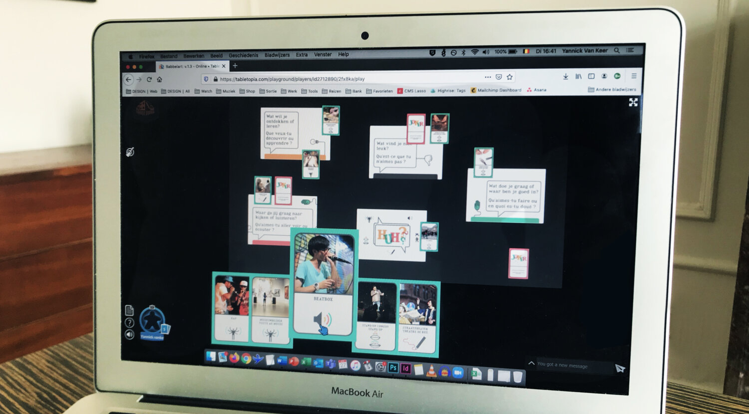 BabbelArt Online est un jeu bilingue (NL/FR) destiné à un public de 14 ans et plus. Pour y jouer il faut disposer d’un ordinateur ou d’une tablette, d’une connexion internet stable et de quoi écrire (papier et stylo). La plateforme de visioconférence permet à un groupe important de se réunir. Sur Tabletopia (la plateforme utilisée pour jouer à BabbelArt Online), les joueur.euse.s sont réparti.e.s en groupes de 6 à 8 personnes. Il n’y a pas de limite au nombre de participant.e.s mais il faut prévoir un maître de jeu pour chaque groupe.